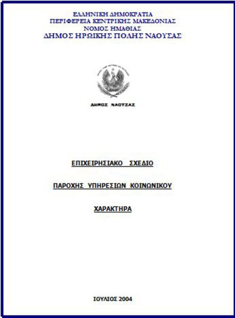 Η εκπόνηση των Επιχειρησιακών Σχεδίων Παροχής Υπηρεσιών Κοινωνικού Χαρακτήρα έγιναν σε εφαρμογή των διατάξεων του Νόμου 3250/2004 για την «Μερική απασχόληση στο Δημόσιο, στους Ο.Τ.Α. Α’ και Β’ βαθμού και τα Νομικά Πρόσωπα Δημοσίου Δικαίου». Η επιτυχής εξέλιξή τους είχε ως αποτέλεσμα την κάλυψη 120 επιδοτούμενων θέσεων απασχόλησης για τον Δήμο Νάουσας.
